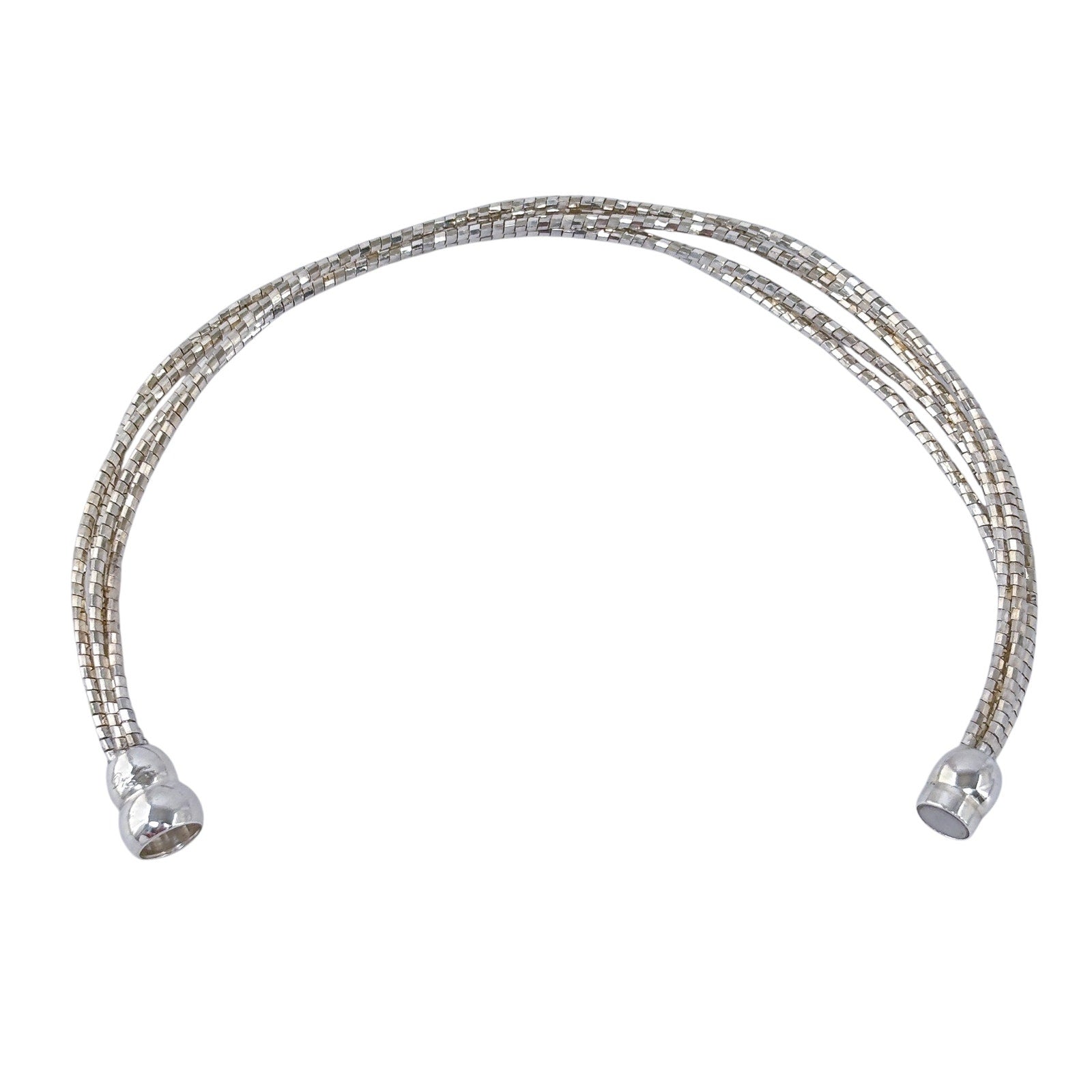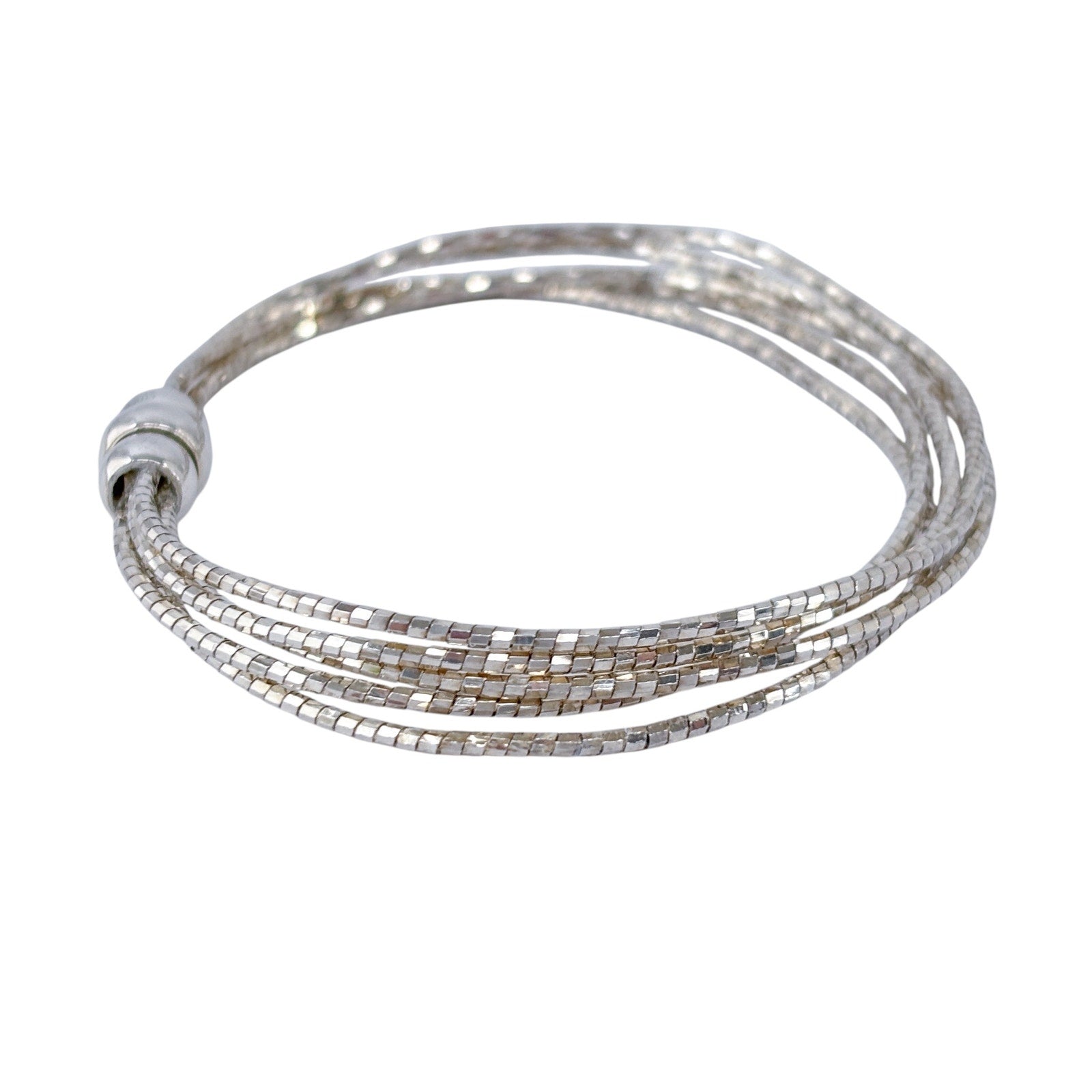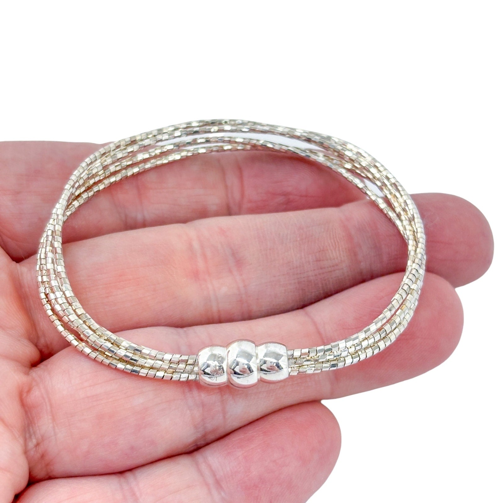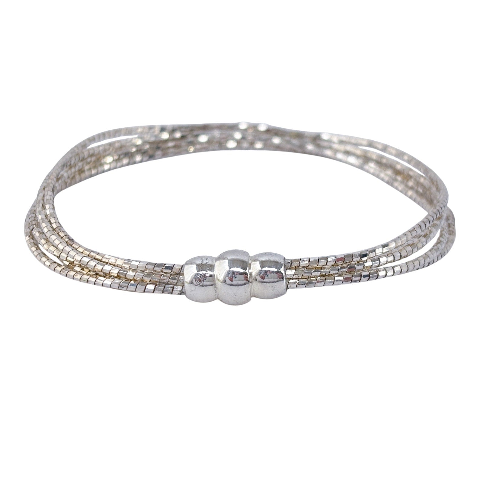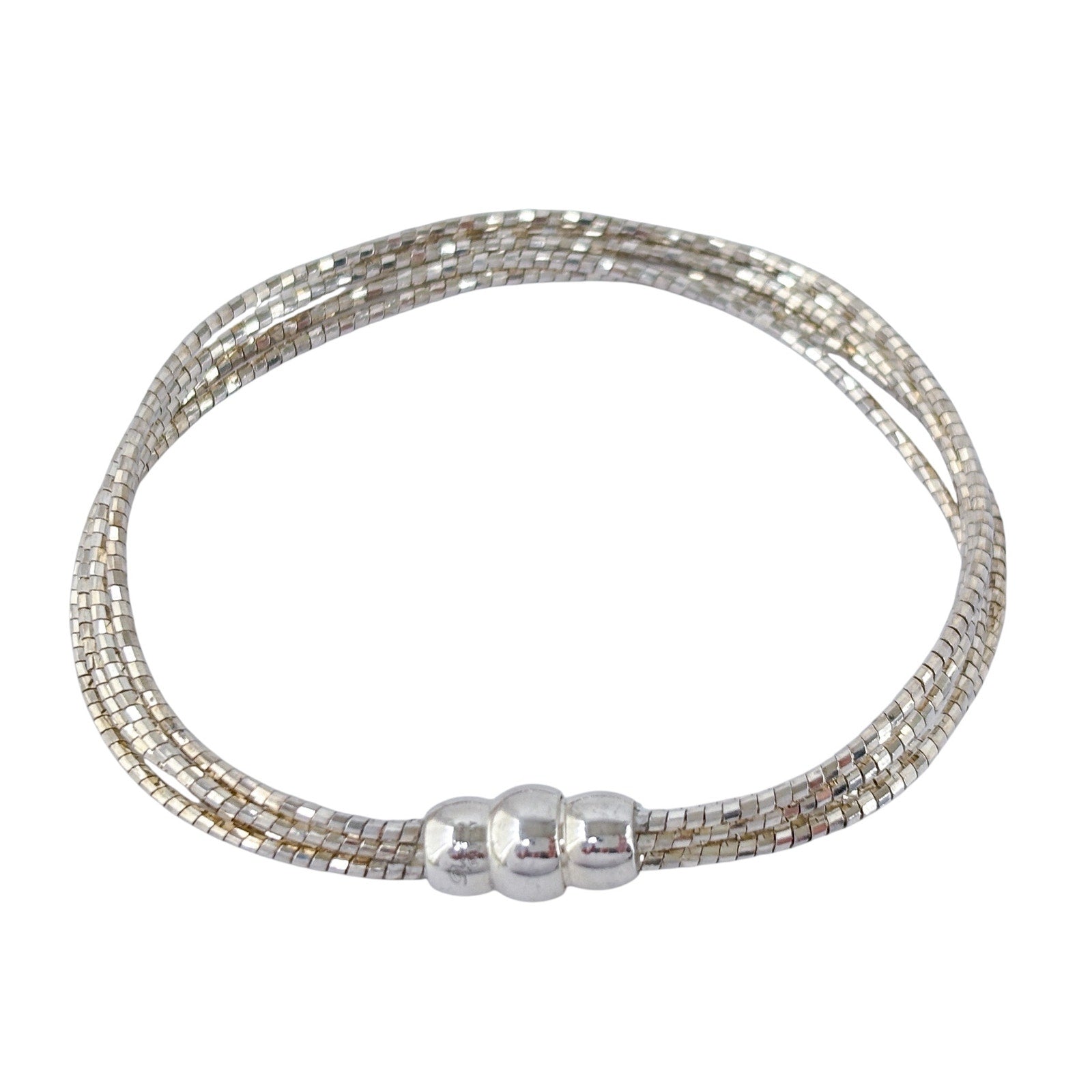 Estate sterling silver bracelet featuring a multi-strand snake chain design with a smooth rounded bead accent at the center. Flexible, fluid construction with a sleek reflective surface, ideal for everyday wear or stacking with other bracelets. Clean modern style with a balanced, polished look.